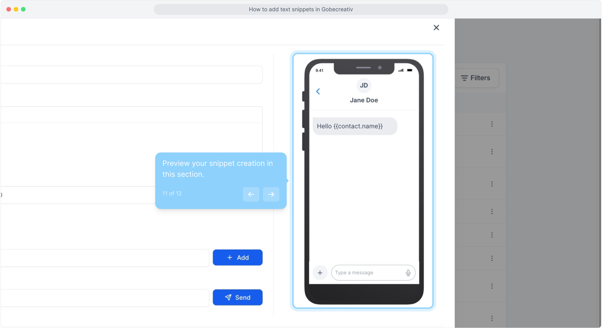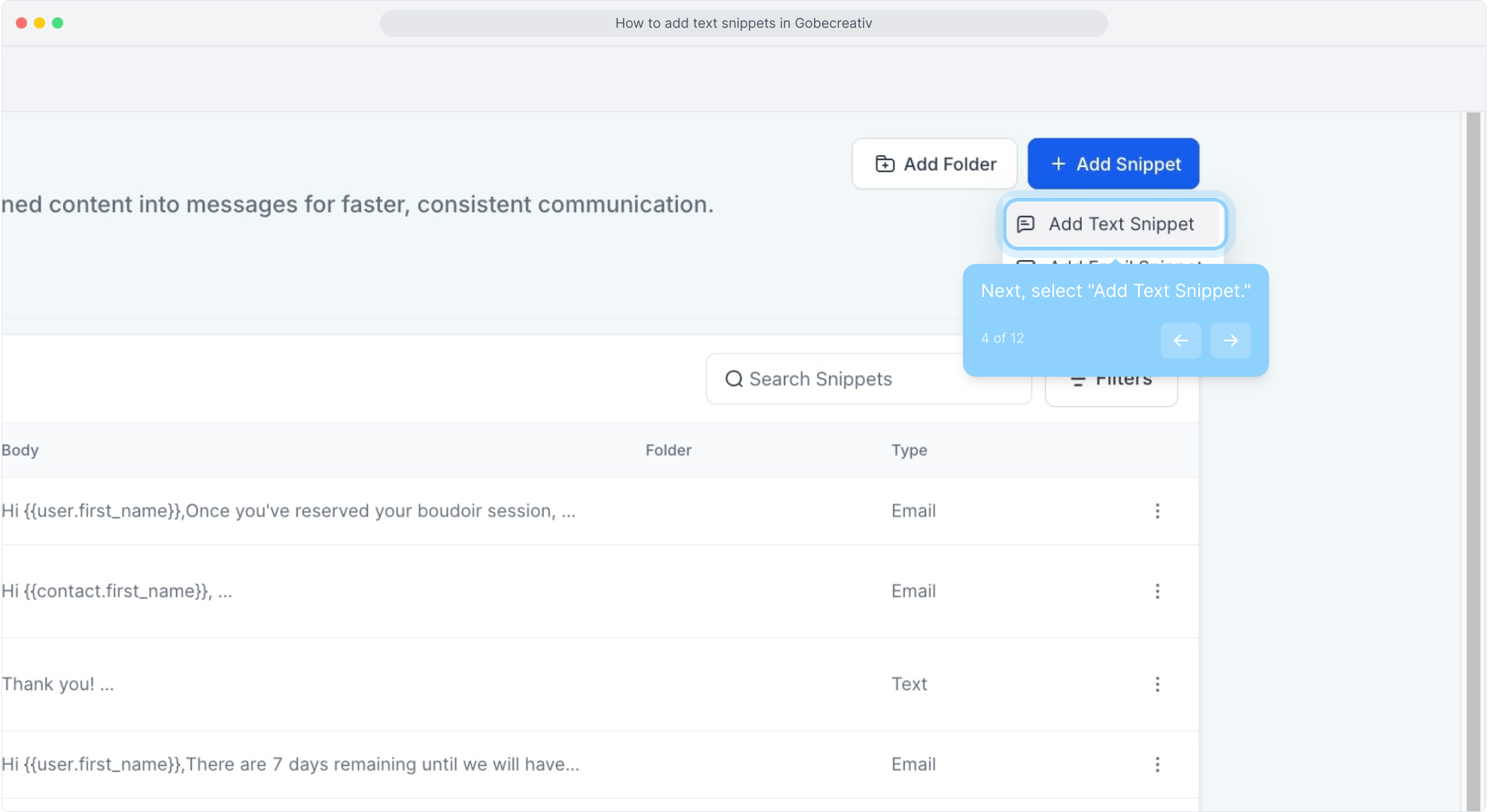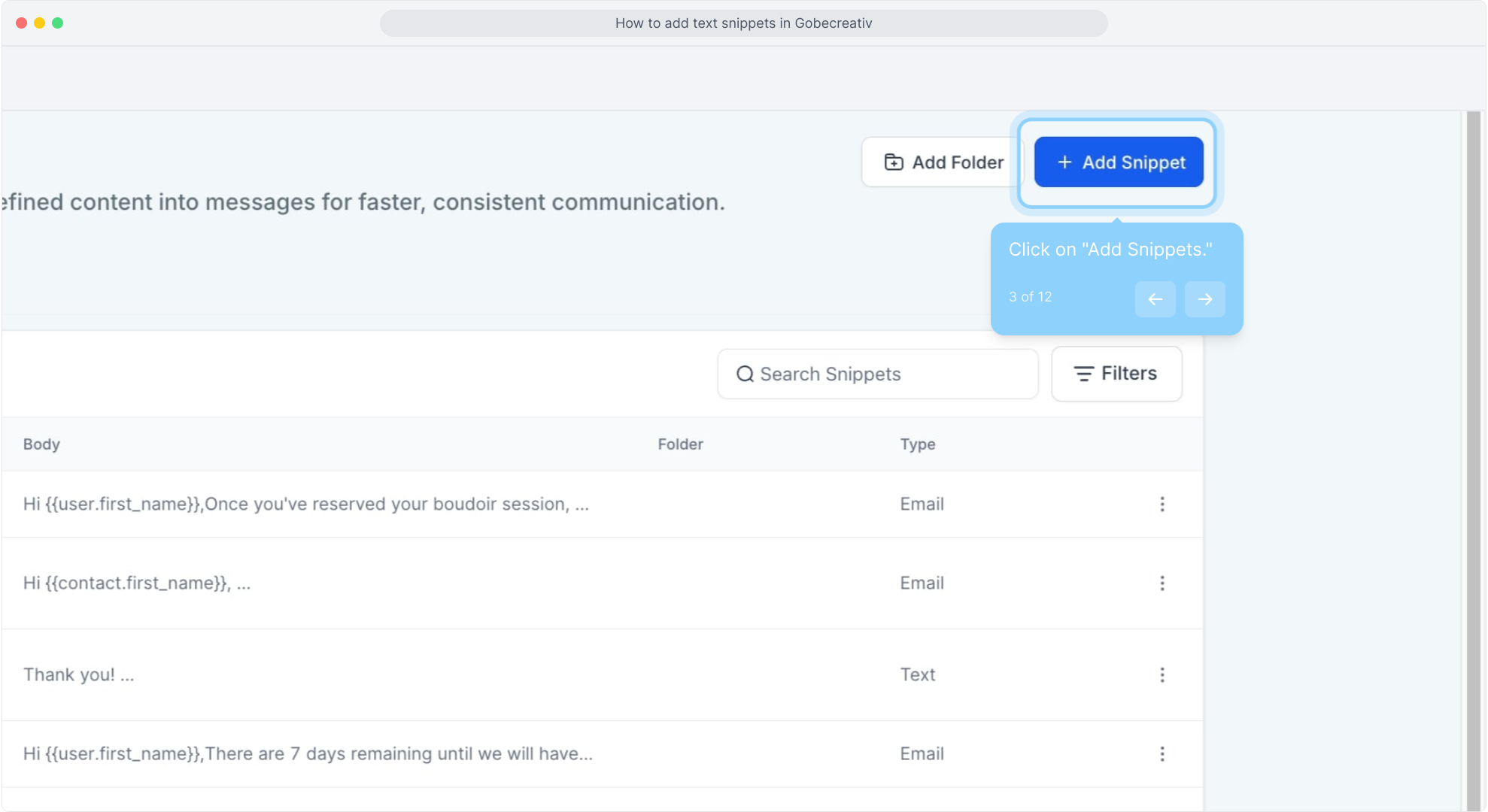 Learn how to create text snippets in Gobecreativ for quick, reusable responses. This guide covers the simple steps to set up and organize your snippets efficiently.