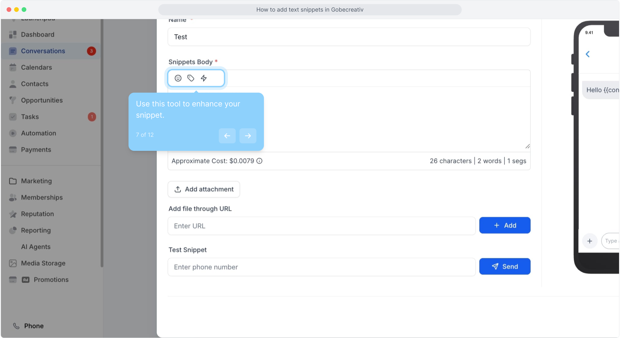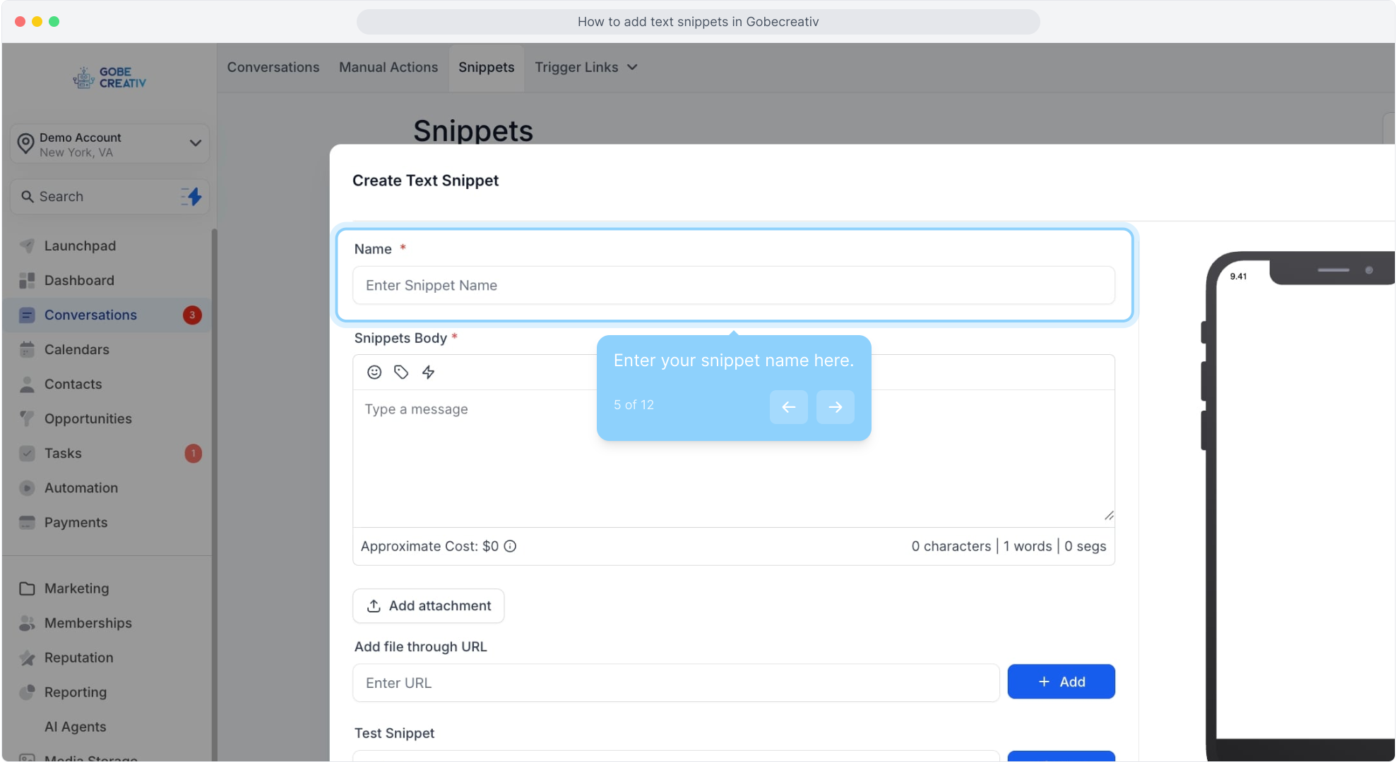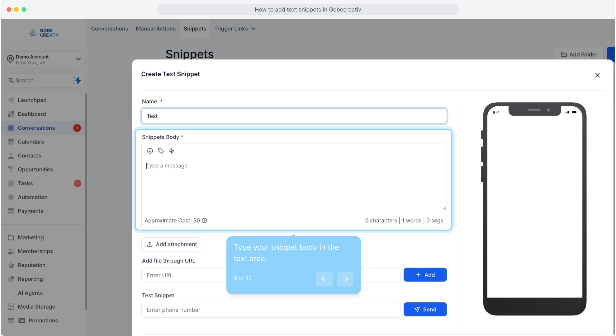 Learn how to create text snippets in Gobecreativ for quick, reusable responses. This guide covers the simple steps to set up and organize your snippets efficiently.